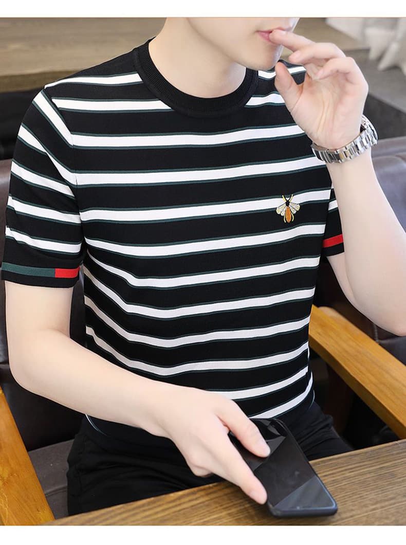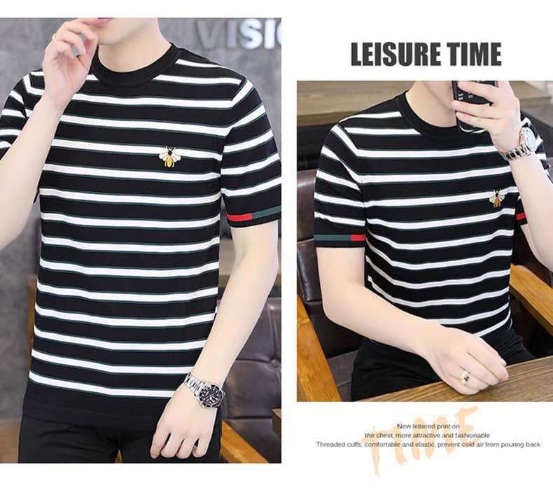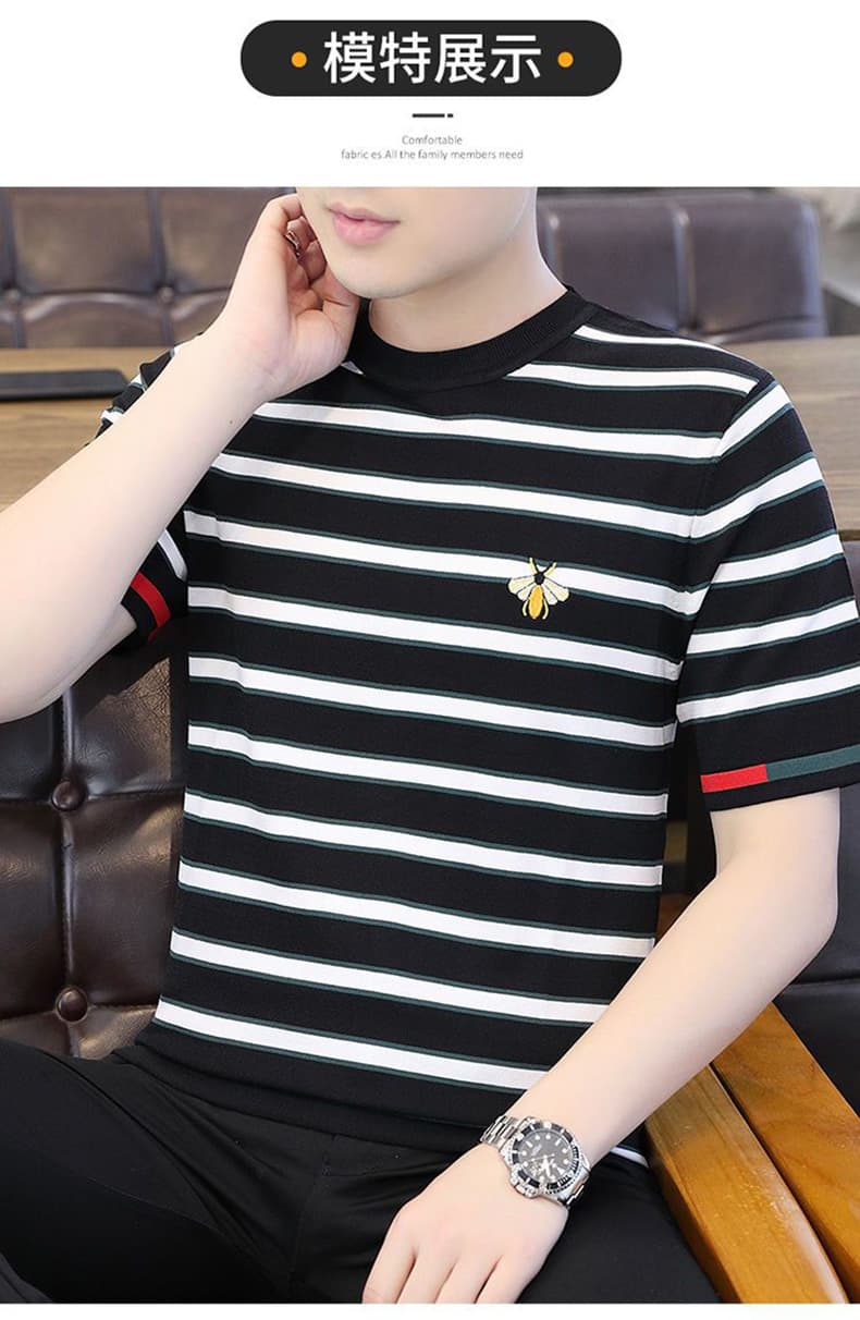 短袖t恤男夏季冰丝针织衫条纹速干上衣2024新款男装半袖冰感体恤