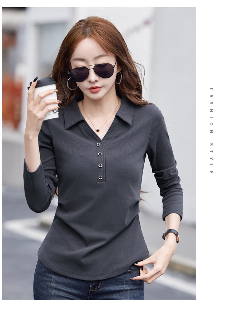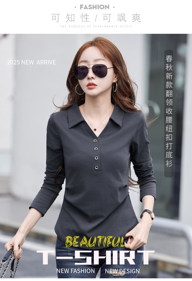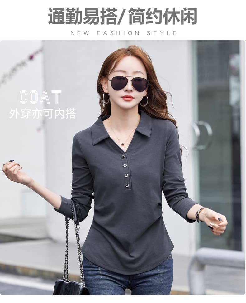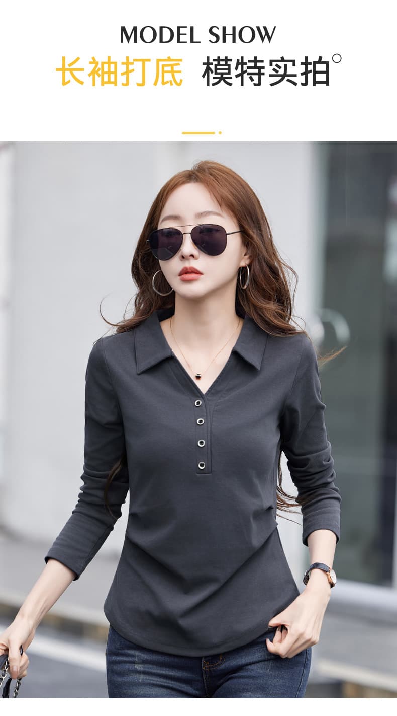 纯棉有领长袖t恤女新款春季洋气宽松翻领收腰上衣打底衫外穿