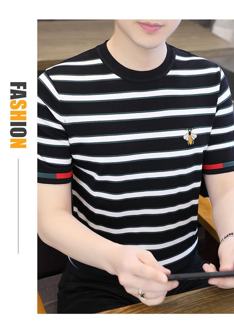 短袖t恤男夏季冰丝针织衫条纹速干上衣2024新款男装半袖冰感体恤