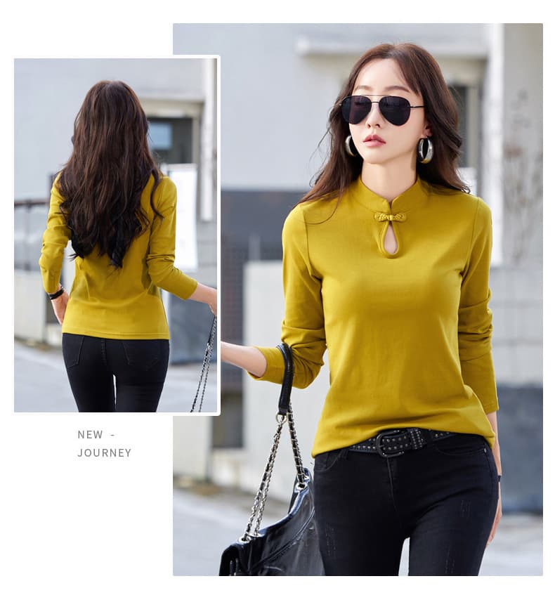 新中式纯棉立领盘扣上衣女国风改良长袖打底衫秋冬修身黑色t恤女
